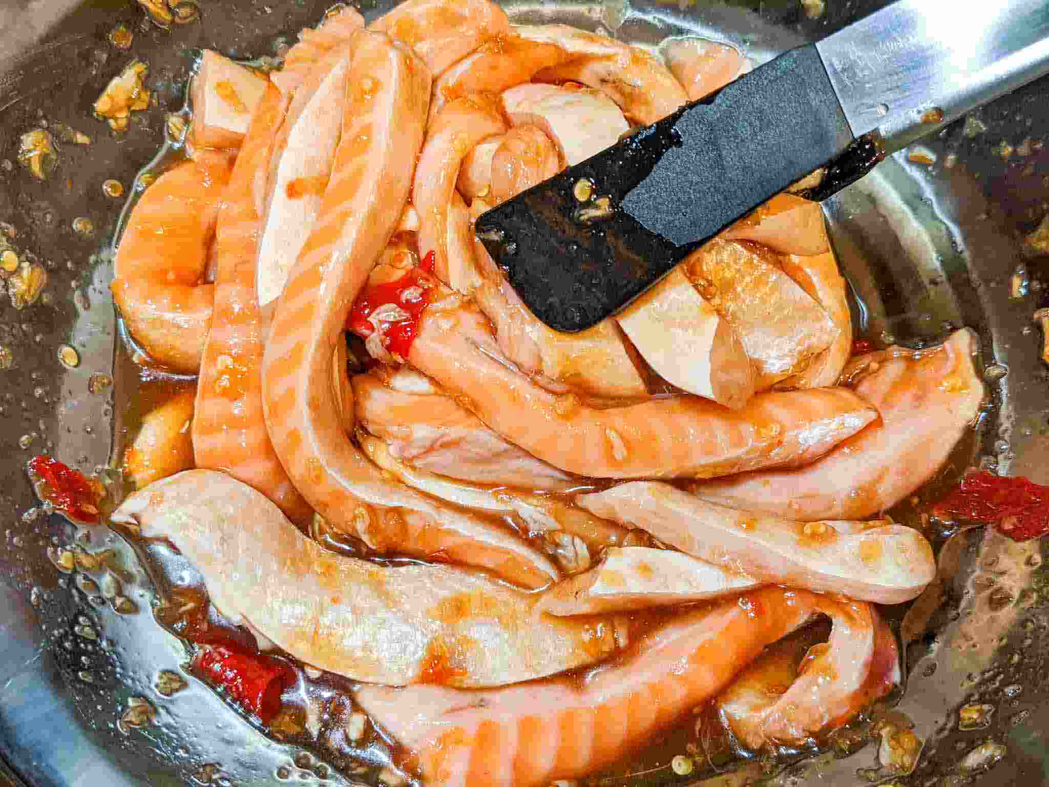 Add garlic cloves and Thai red chilies to the mortar and pestle. Pound into a rough paste. Then add the rest of the ingredients except Salmon bellies and mix well until the palm sugar dissolves.*