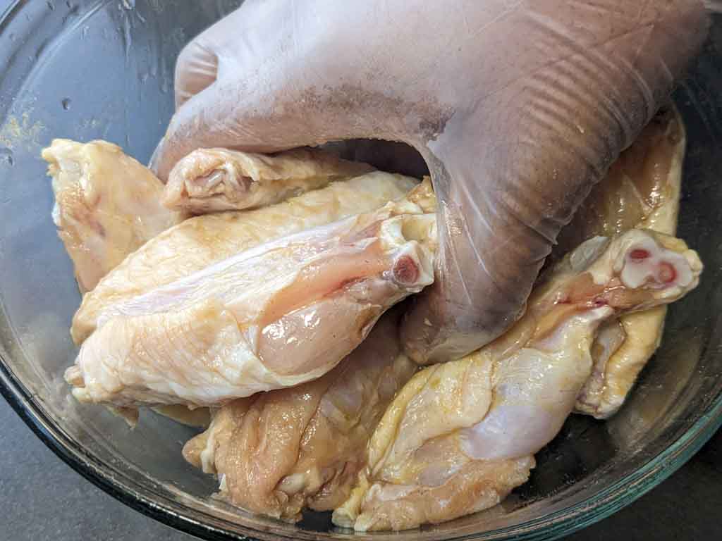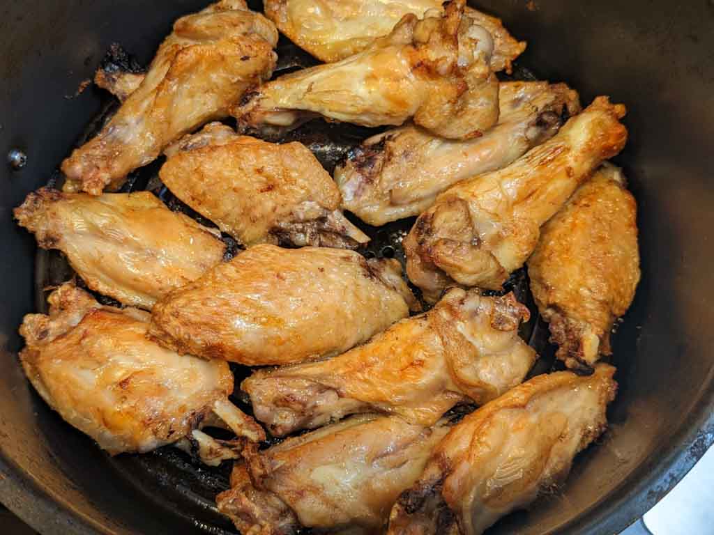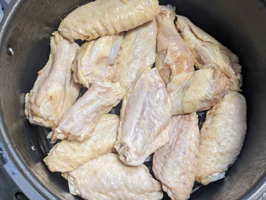 You can add a tiny amount of neutral cooking oil to the wings, especially if you’re using chicken drums/drumettes. Add it when you marinate chicken wings before air-frying.