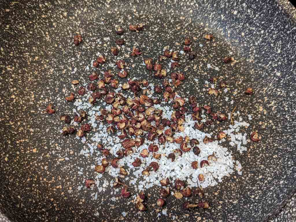 To a small pan, add Sichuan peppercorns and salt. Slowly roast them in medium-low heat until peppercorns turn brown in color and feels aromatic.