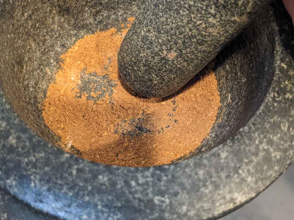 Transfer them to a mortar and pestle (You can also use a small spice/coffee grinder). Grind them to a powder.