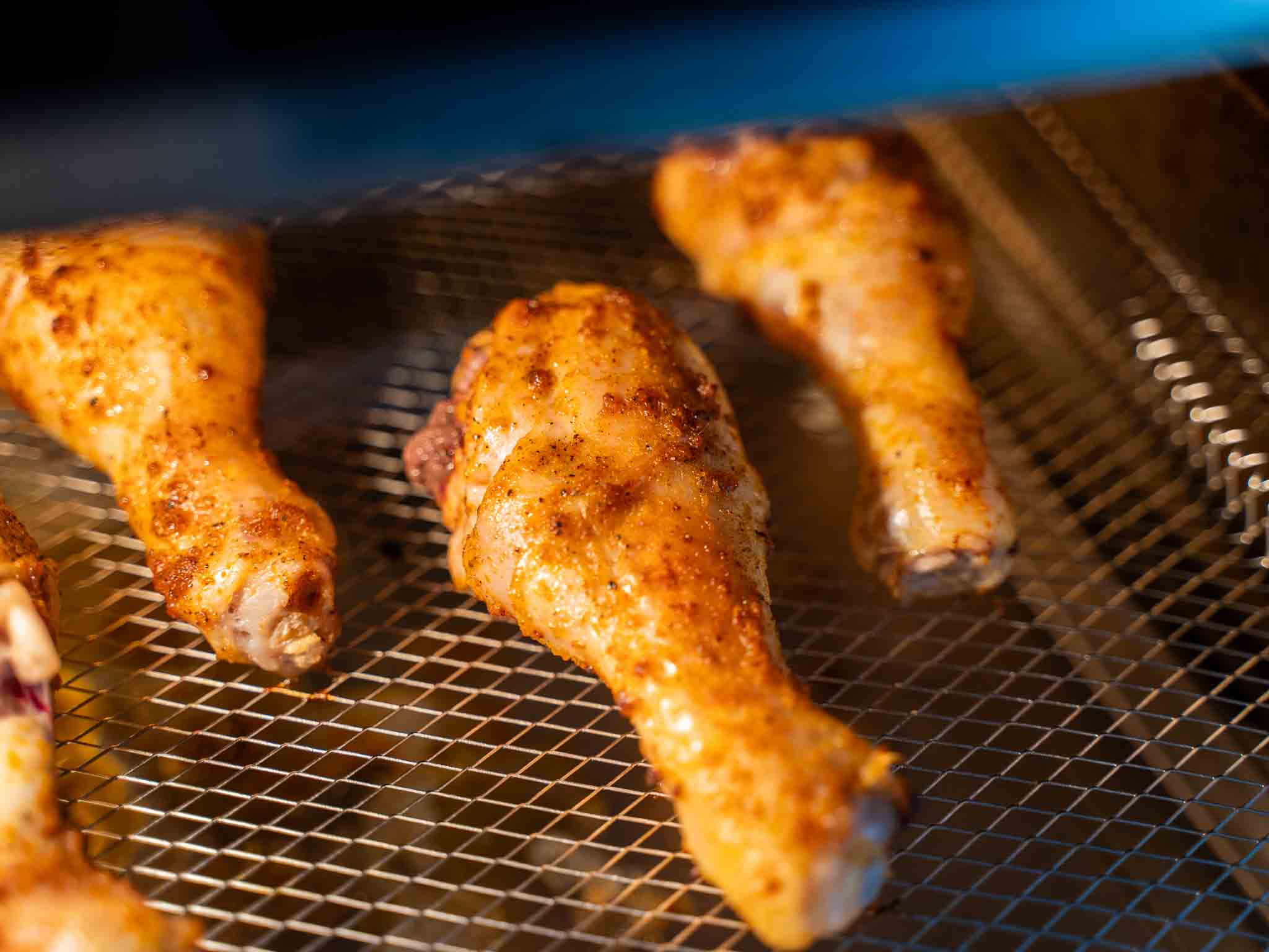 Arrange them in the air fryer basket/tray in one layer. Air Fry at 390°F/200 °C for 20 minutes. Flip the chicken drumsticks halfway through for even browning.