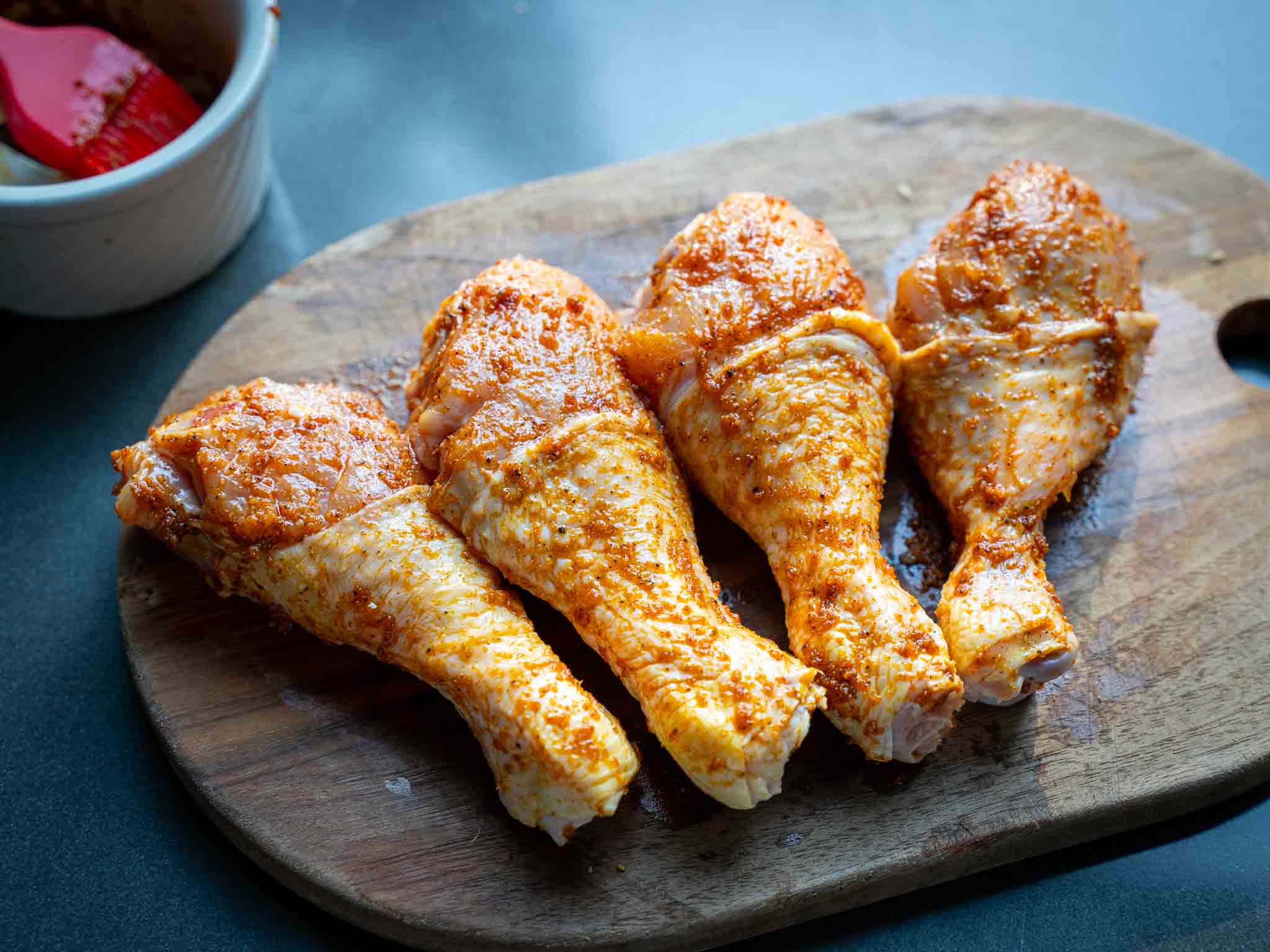 Coat the chicken drumsticks with the spice mixture. You can either use a brush or rub the spices with your hands. Marinate the chicken for at least 15-30 minutes on the counter or overnight in the fridge. (The longer you marinate, the better they taste)