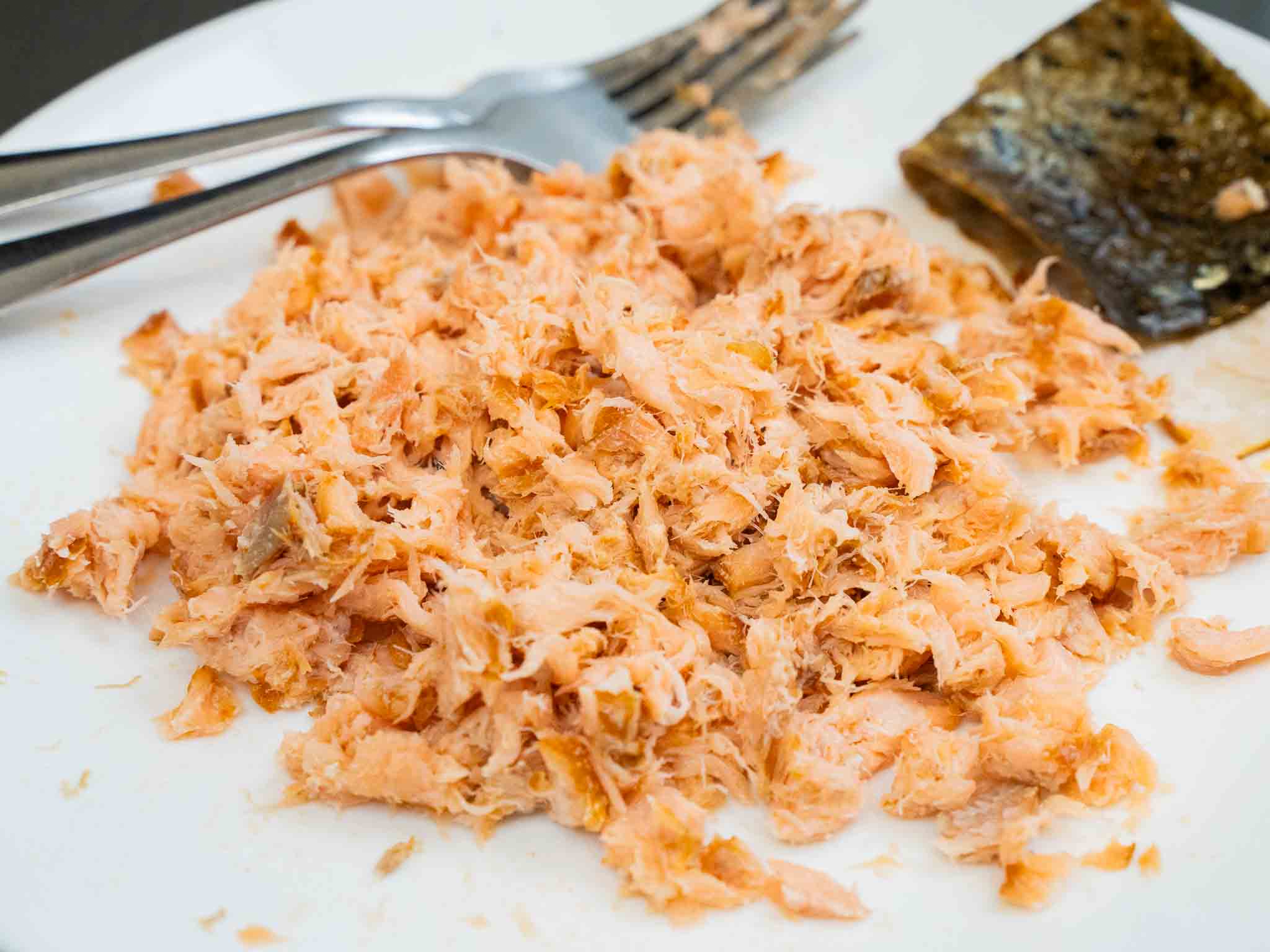 1. Remove the salmon skin from the smoked salmon. Then break the salmon into small flakes using two forks.  If your smoked salmon is hard and dry, use the food processor to chop it finely.