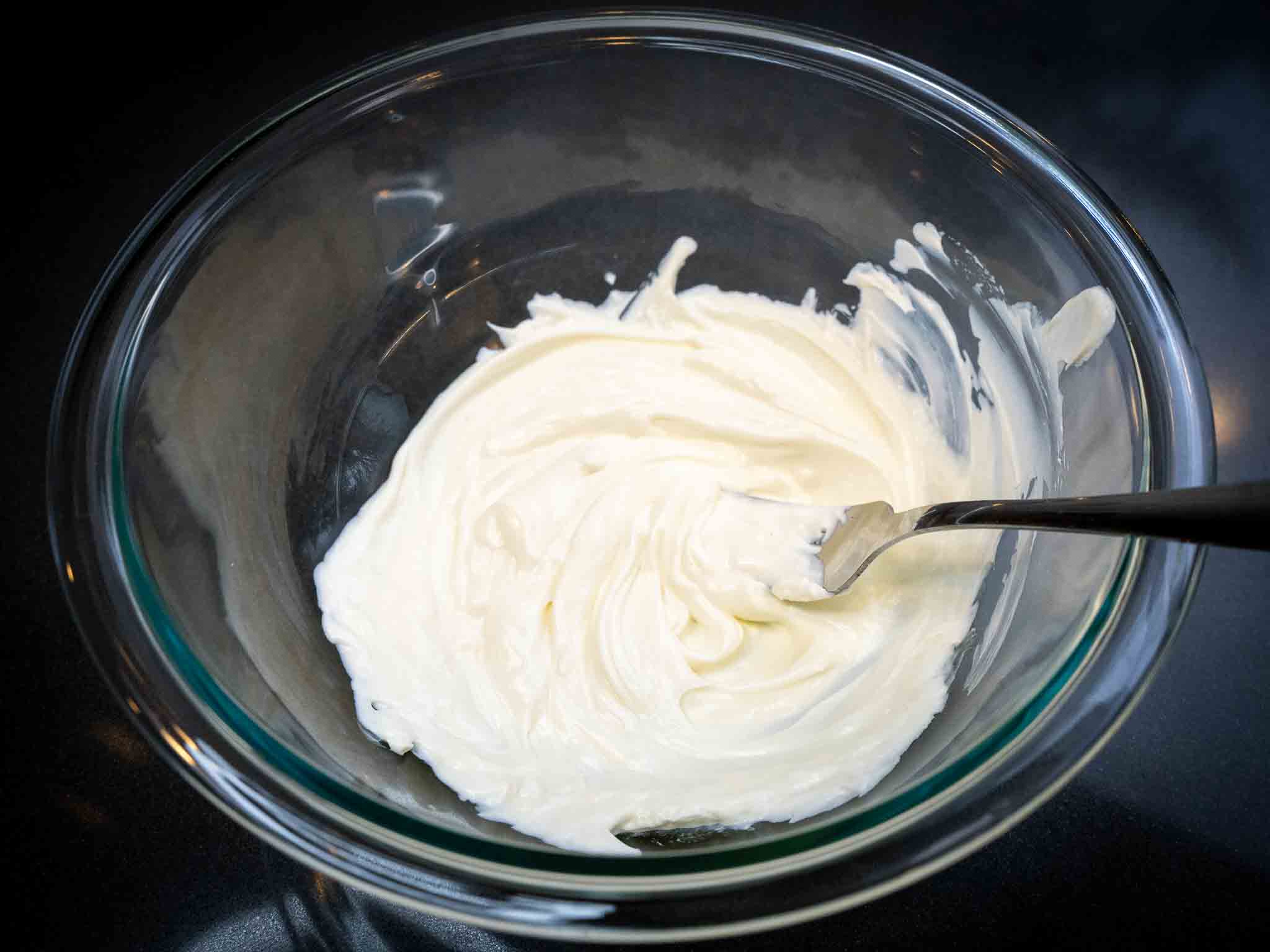2. Add the cream cheese to a microwave-friendly bowl. Microwave for 30 seconds until the cream cheese is softer. Whip it a little bit with a fork so it's smooth and lump-free.
