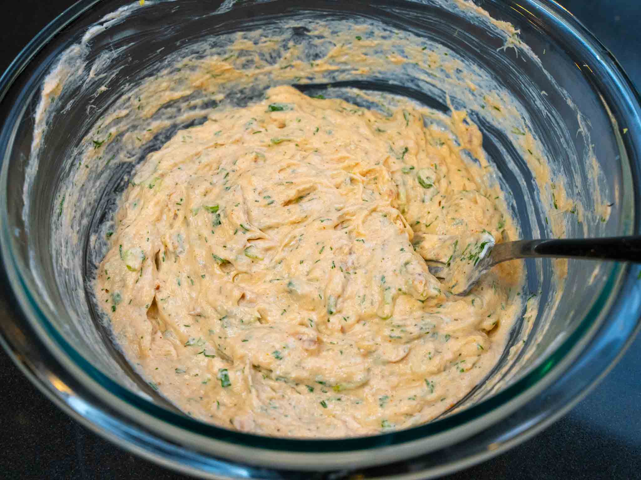3. To cream cheese, add salmon, sour cream, dill, spring onions, paprika, lemon zest, and lemon juice. Mix well. Taste and adjust seasonings if necessary.