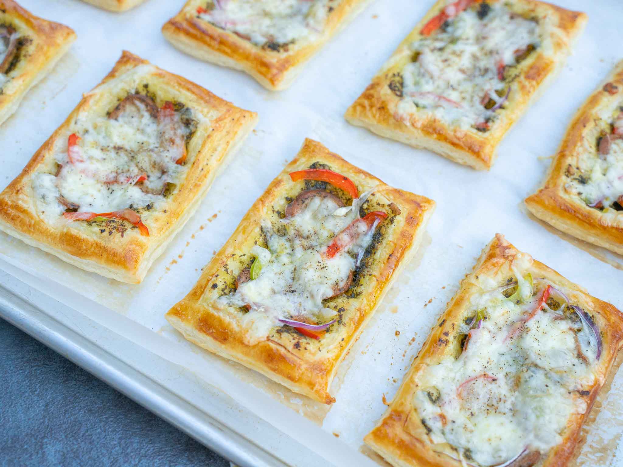 My quick and easy recipe to make golden and flaky puff pastry squares topped with Pesto, Sausage, Peppers, Onion, and Cheese. So delicious!