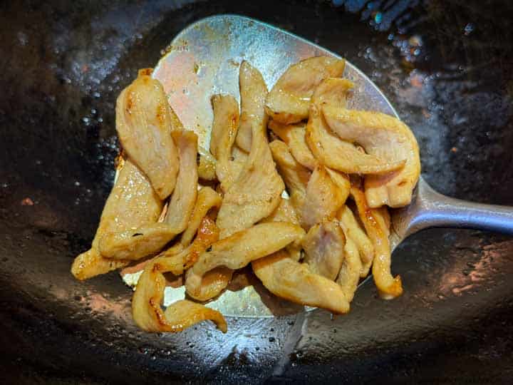 Heat a wok until it's smoking hot. Add 1 tbsp of oil. Add chicken and spread it around the wok so every piece touches the bottom. Let it fry untouched for about a minute. Flip the meat and cook until the chicken pieces are all the way cooked through. Remove the cooked chicken to a separate plate.