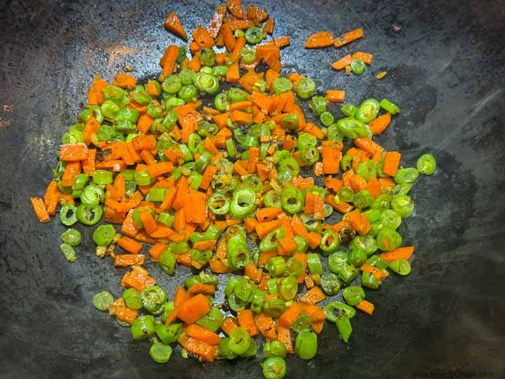Add 1 tbsp oil to the wok. Add ginger and let it fry in oil for a few seconds. Then add carrot. Mix well and cook for about 30 seconds or until carrots start to soften. Then add green beans. Cook until the color of the green beans turns to a lighter green.