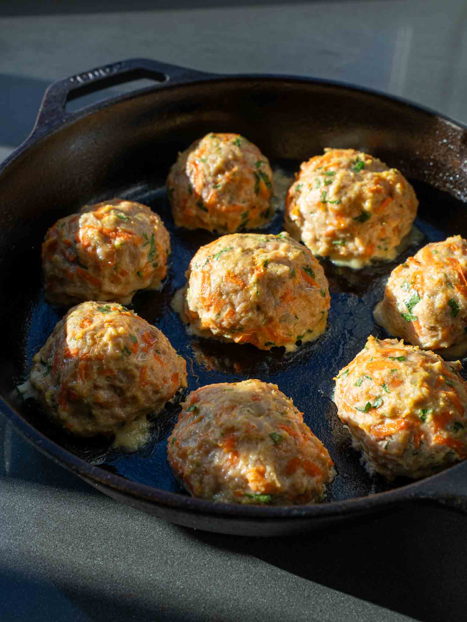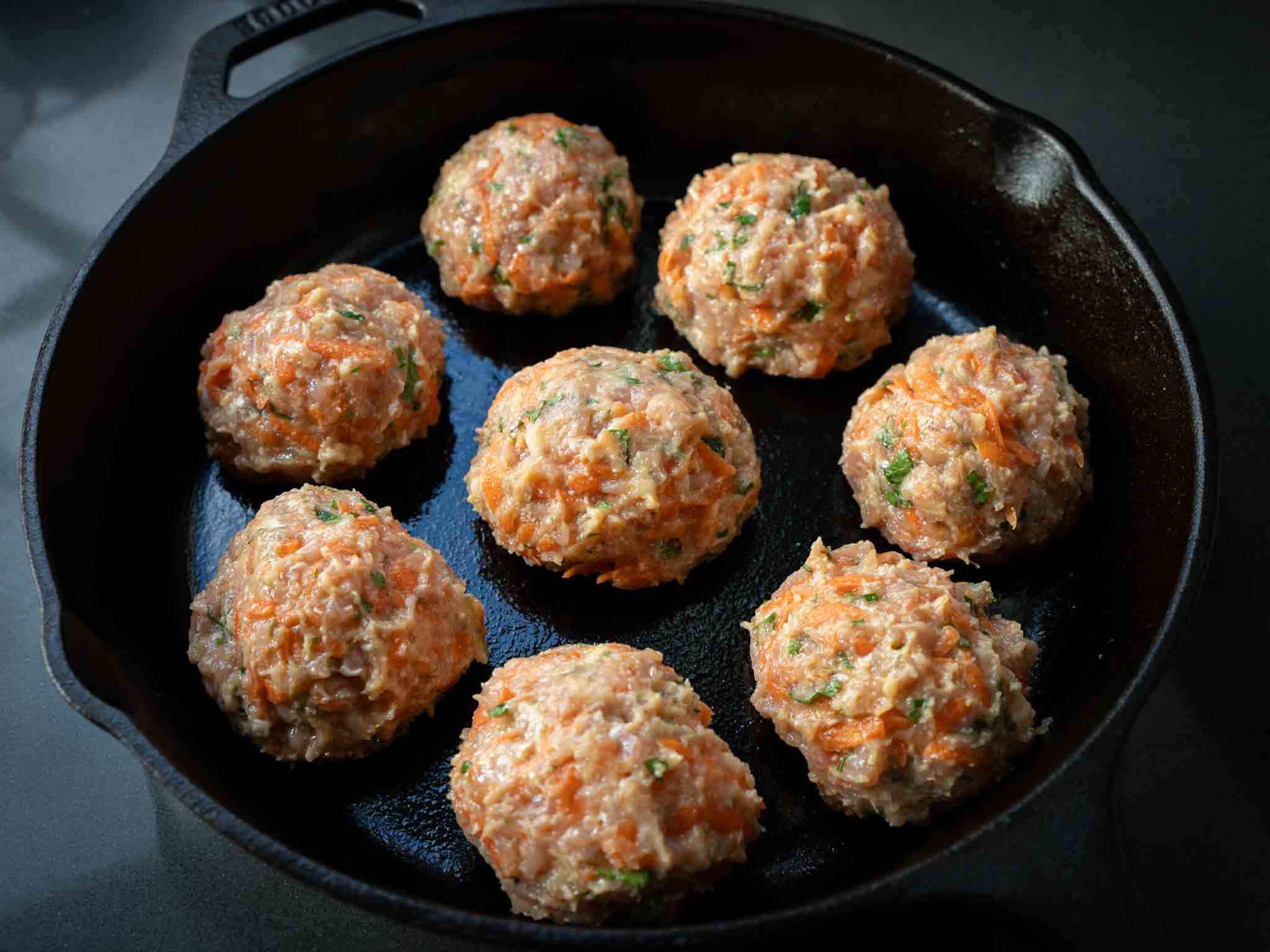 Make 8 - 10 equal size meatballs, roll them with your hand and place them on a baking tray or a cast iron pan.