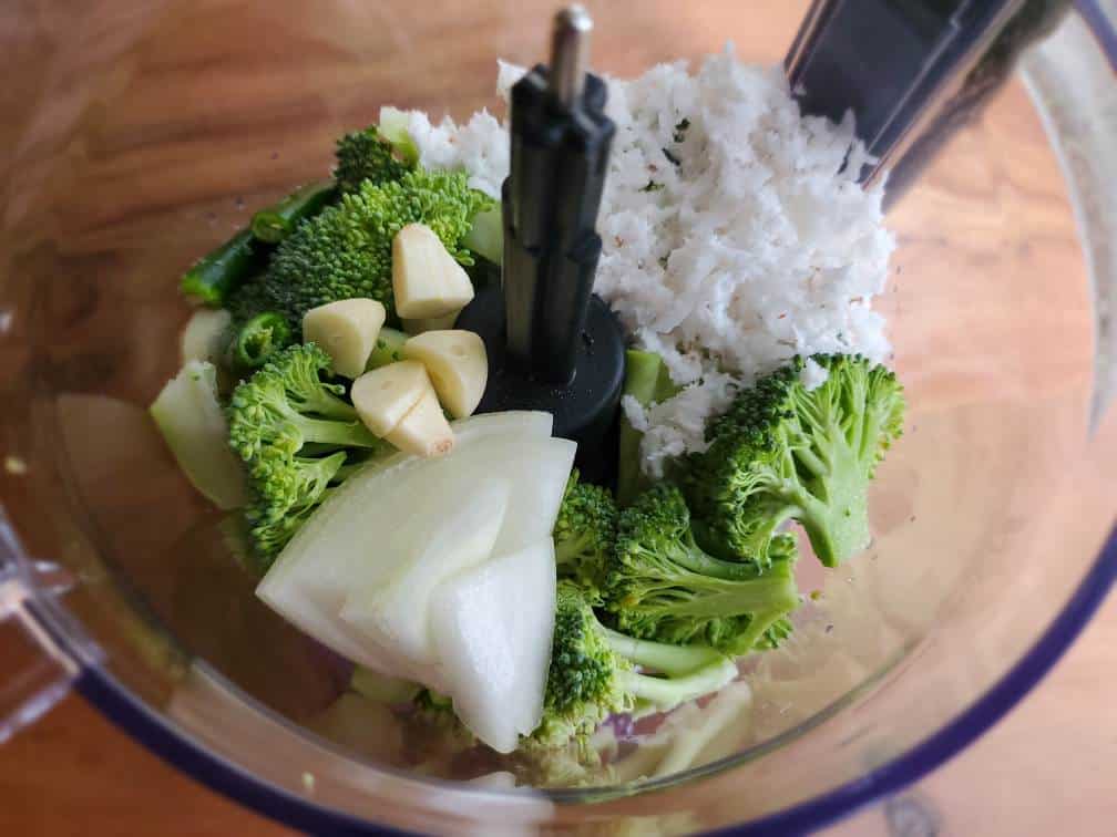 1. Put broccoli florets (you can use the tender parts of the stem too), coconut, onion, green chili, garlic, and salt into the food processor.