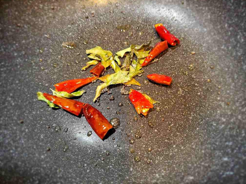 3. Heat a frypan or a wok. Add coconut oil and let it heat up. Then add mustard seeds. When seeds start to splatter, add broken red chilies and curry leaves (be careful because curry leaves splatter).