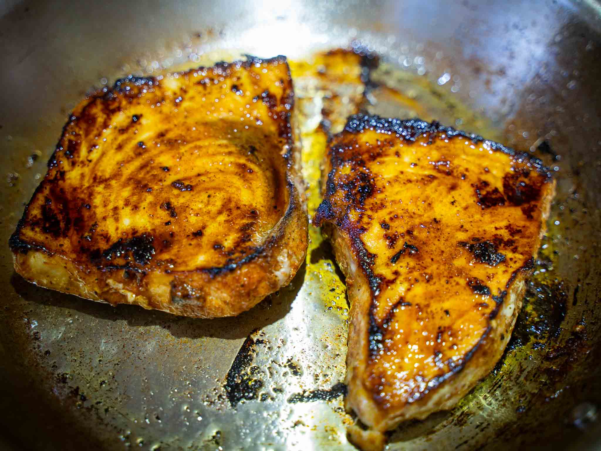 Flip the fish steaks and cook for another 4 - 5 minutes, until they're golden and cooked through and the internal temperature reaches slightly over 14o°F / 60 °C.