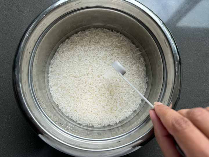 3. Measure and add water to the rice. (1 cup rice: 1.25 cup water ratio). Also, add salt and oil if you prefer.