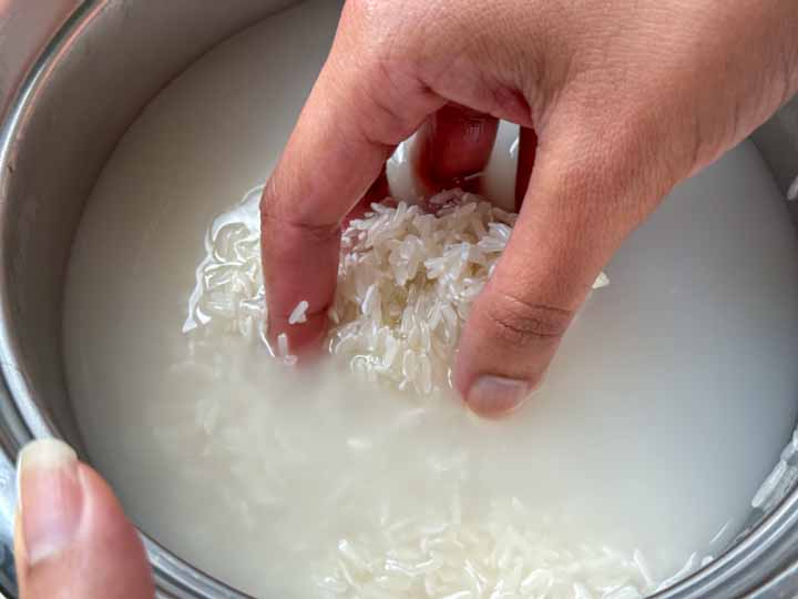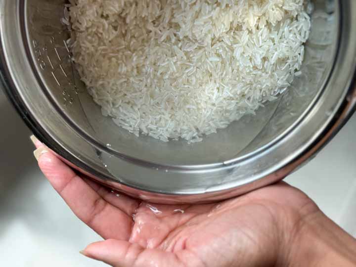 1. Add rice to the removable rice cooker inner pot. Wash Jasmine rice about 3-4 times or until the water is not cloudy. Rub and stir the rice grains with your fingers while washing, it helps to loosen up the excess starch coating the grains. After washing the rice grains should look shinier than before.