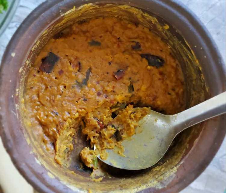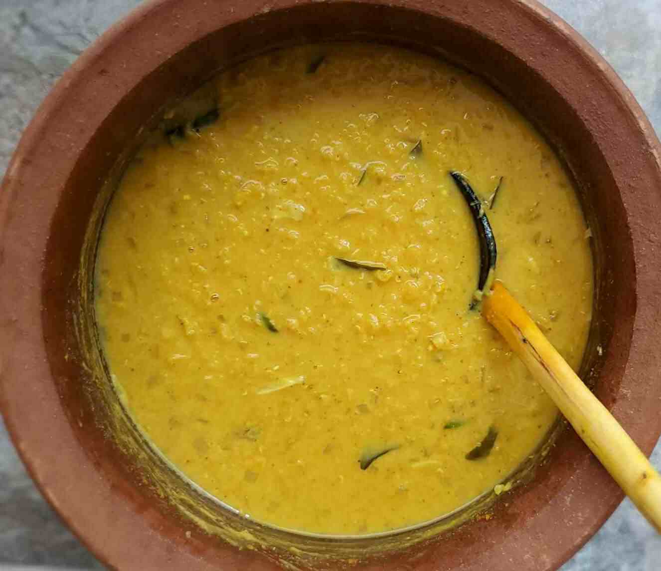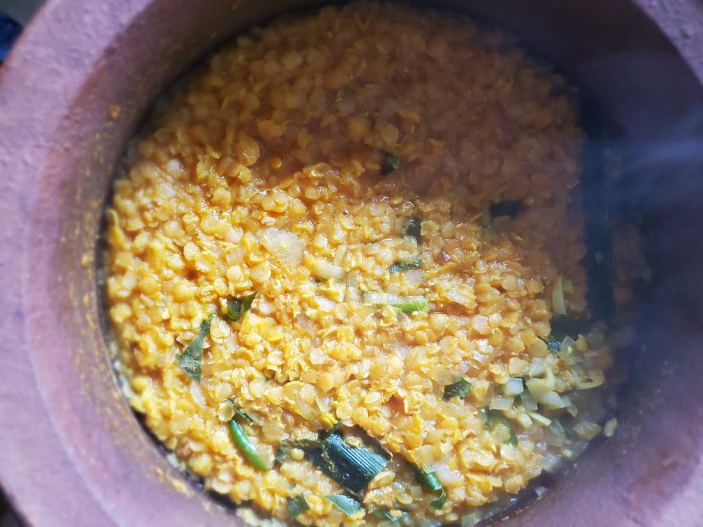For this recipe, you’re going to make the tempered lentil curry first. If it’s not in a heavy bottom pot already, put the curry into a heavy bottom pot. It’s important that you use a pot that can retain heat after you turn off the heat. A clay pot or a cast iron dutch oven would be ideal. Now cook the curry in the lowest setting for about 20 - 30 mins uncovered, until it gets very thick. The time may vary depending on the heat level and your pot. So be watchful and check on it from time to time. Make sure to stir occasionally to avoid burning. When the curry is very thick, leave it uncovered for about 15 mins to settle down. It gets thicker when it cools down. And here's your dry lentil curry.