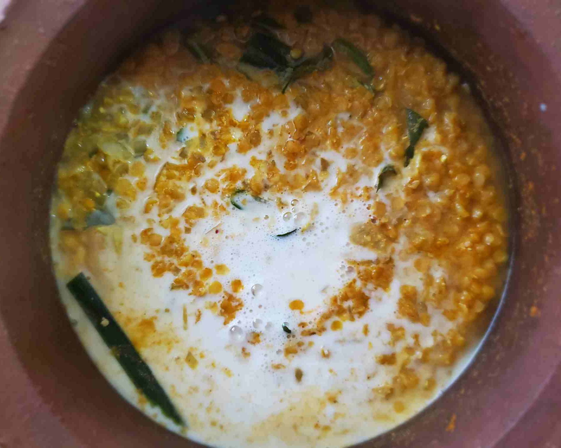 When all the lentils are cooked properly, add coconut milk, stir and simmer for a few mins. Adjust the salt if needed. And turn the heat off.
