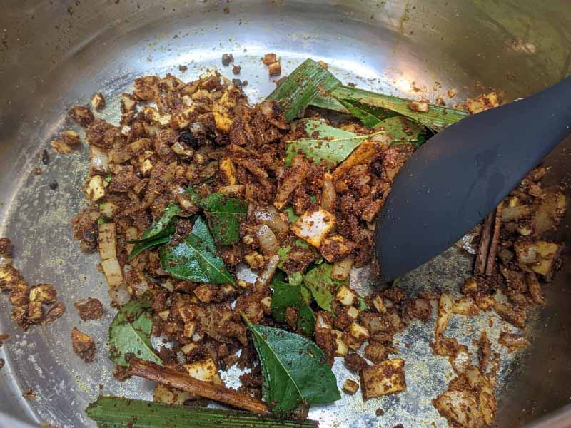 If the spices start to stick to the bottom, turn off the instant pot. The residual heat is enough for the rest of the ingredients. Add curry leaves, pandan leaves, garlic, ginger, onion, Goraka/Garcinia, cinnamon, coconut slices, Maldive fish flakes and saute until onions become soft.