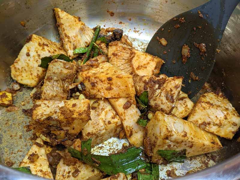Then add your young jackfruit pieces. Mix well with the spices.