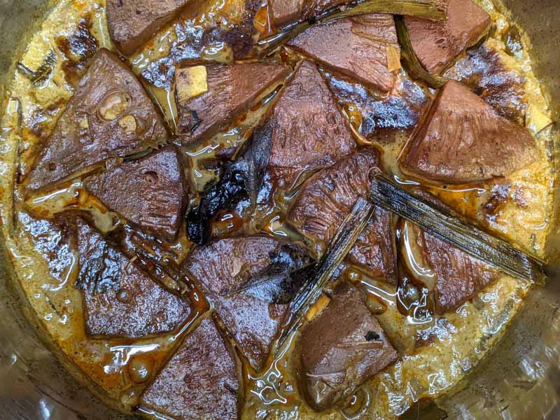 The old and traditional method to make Polos curry is on a wood-fired stove, on very low heat, overnight. That’s how grandmas made the curry when gas stoves are not popular. That slow-cooking makes the tough young jack fruit very tender and they actually get a pink-red hue from slow-cooking which makes the curry very appealing. And spices, salt, and sour to penetrate the jack fruit pieces and make them super flavorful. Coconut milk slowly breakdown into fats and solids and that fat keeps them from drying out from longer cooking. Also adds a nice creaminess to the curry. And roasted coconut gives a nice hint of sweetness that balances out the sourness from dried Garcinia cambogia (Goraka) Wood-fired stoves also give them a nice smoky flavor.