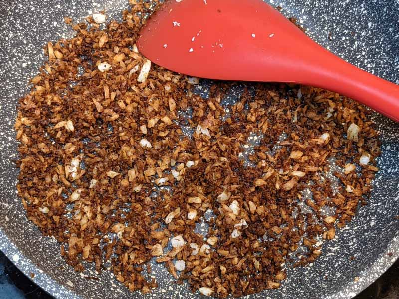 While the curry is cooking, dry roast the grated coconut in a pan until they become dark brown.