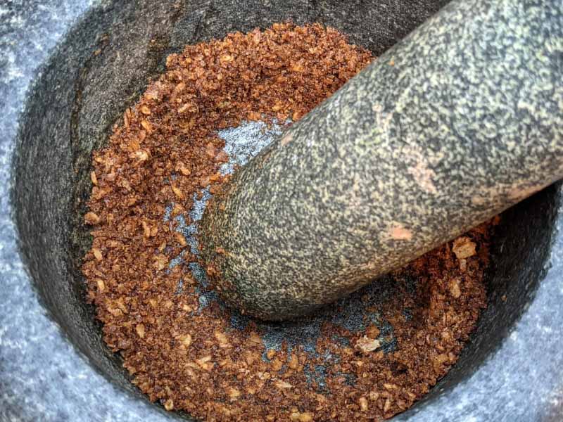 In a mortar and pestle or in a spice grinder or blender, grind the roasted coconut until they become a rough powder.