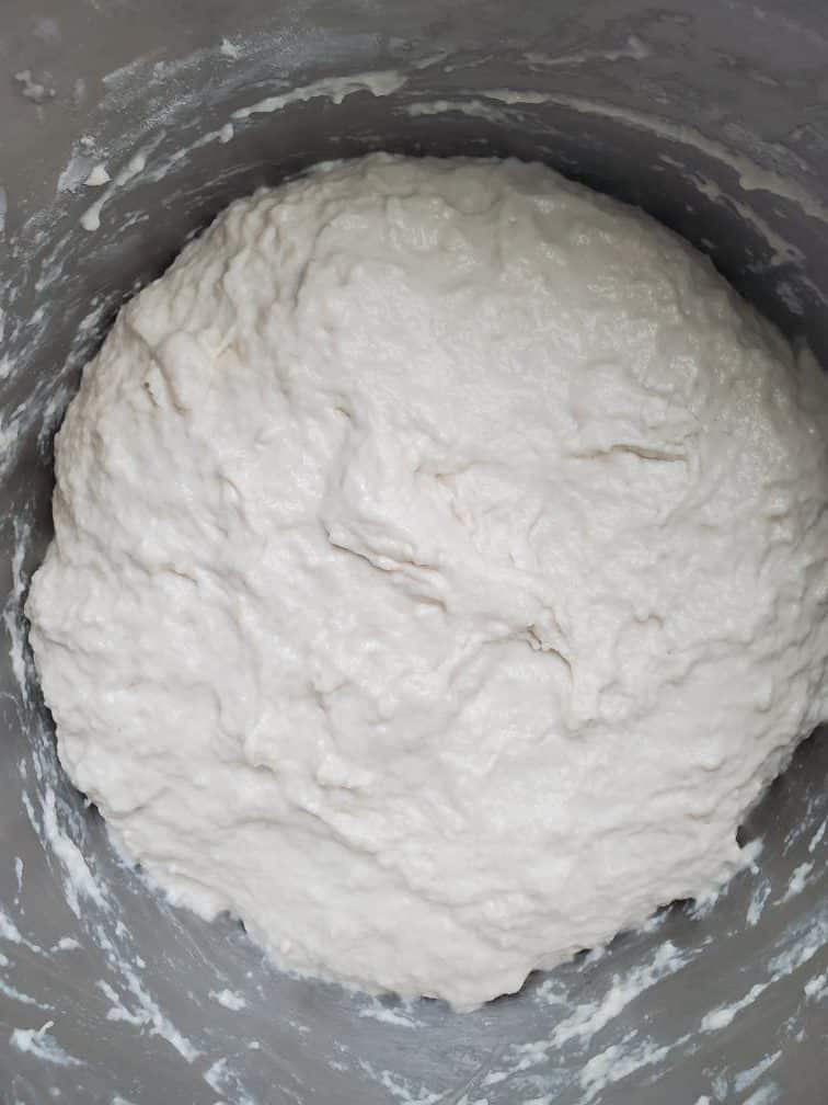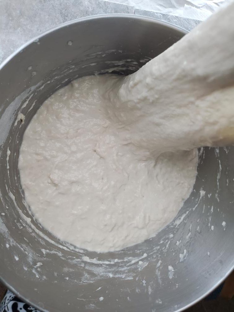 Mix water and sourdough starter in a bowl. Then add salt and flour. Mix everything well together using your hands until the salt dissolves. Cover and autolyze for 30min - 45mins.