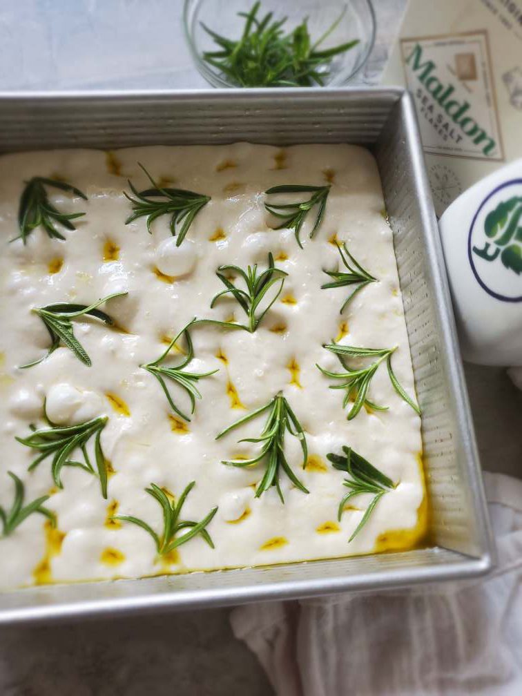 Preheat the oven to 450F. Now drizzle more olive oil on the top. Oil your fingers. Gently poke holes in the dough with your fingers. Place some rosemary and gently press it to the dough. Sprinkle some flaky sea salt. (You can top with anything you like)