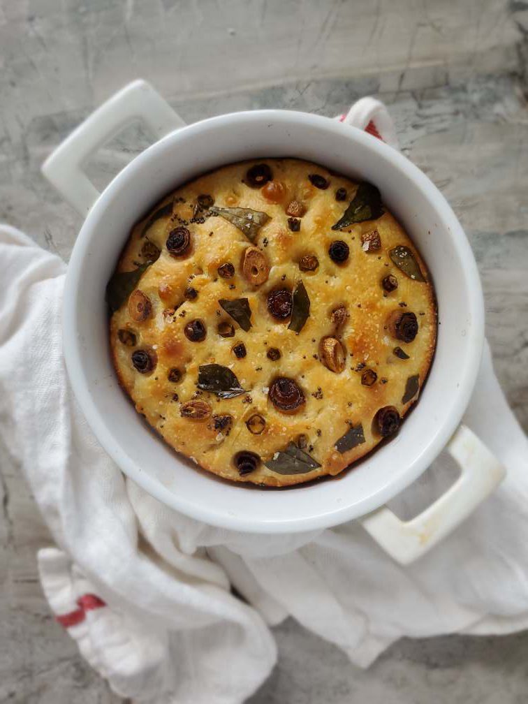 For the small focaccia that I made in the small round pan, I used coconut oil instead of olive oil. And I fried some shallots, garlic and curry leaves and mustard seeds to infuse coconut oil with flavors. Then I used that coconut oil to drizzle the focaccia with. And I used those shallots, garlic, curry leaves and mustard seeds and some chilies as the topping. Actually this turned out soooo good, I love this better than any of the focaccias I’ve made so far. So if you want to go out of the box and try some new flavors, try this one too