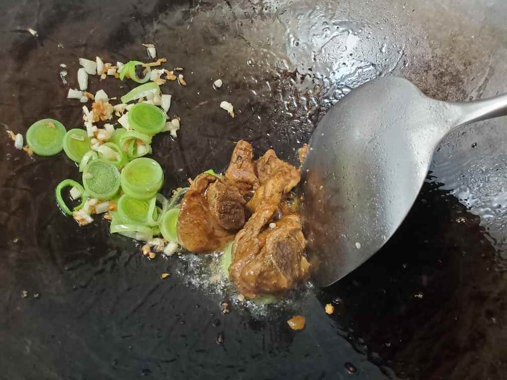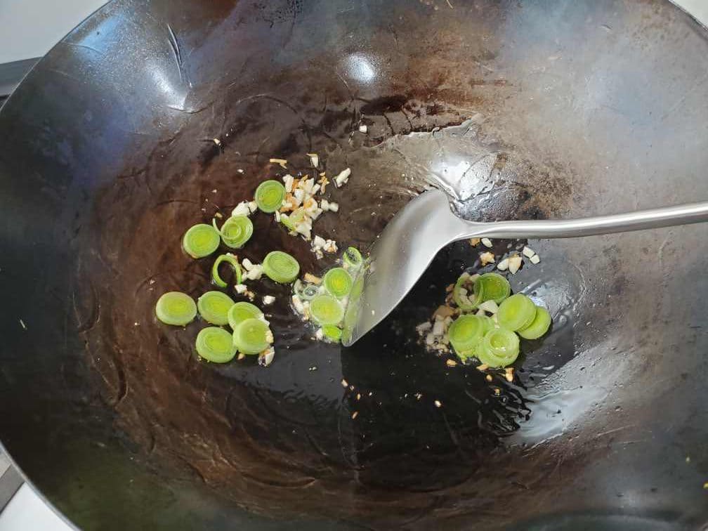 Heat oil in a wok and add minced ginger, garlic, and leek rings. (White part or light green part only)