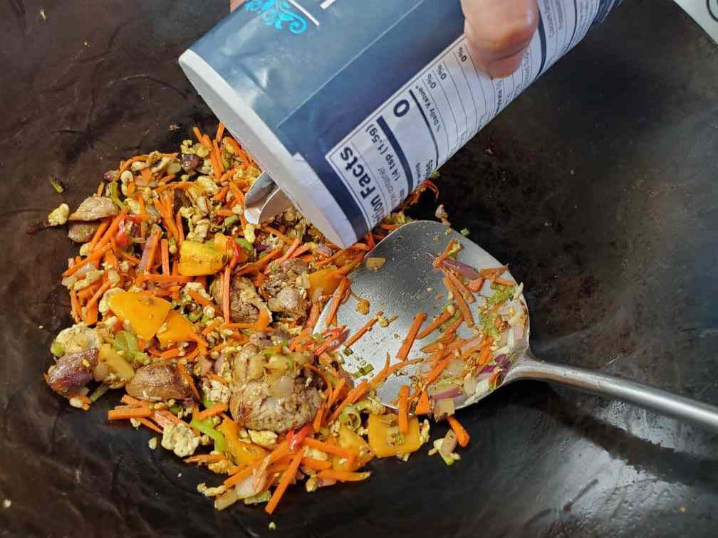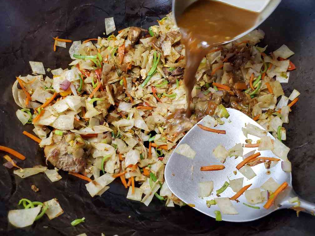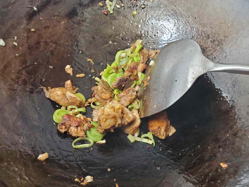 Add the chicken pieces you took from the chicken curry to the wok. Break them using your wok spatula. You can also cut them beforehand if it's hard to break the chicken pieces with the spatula.