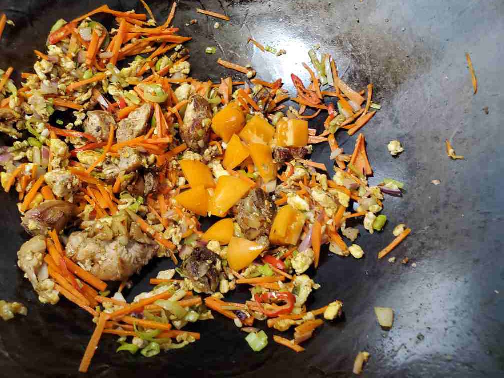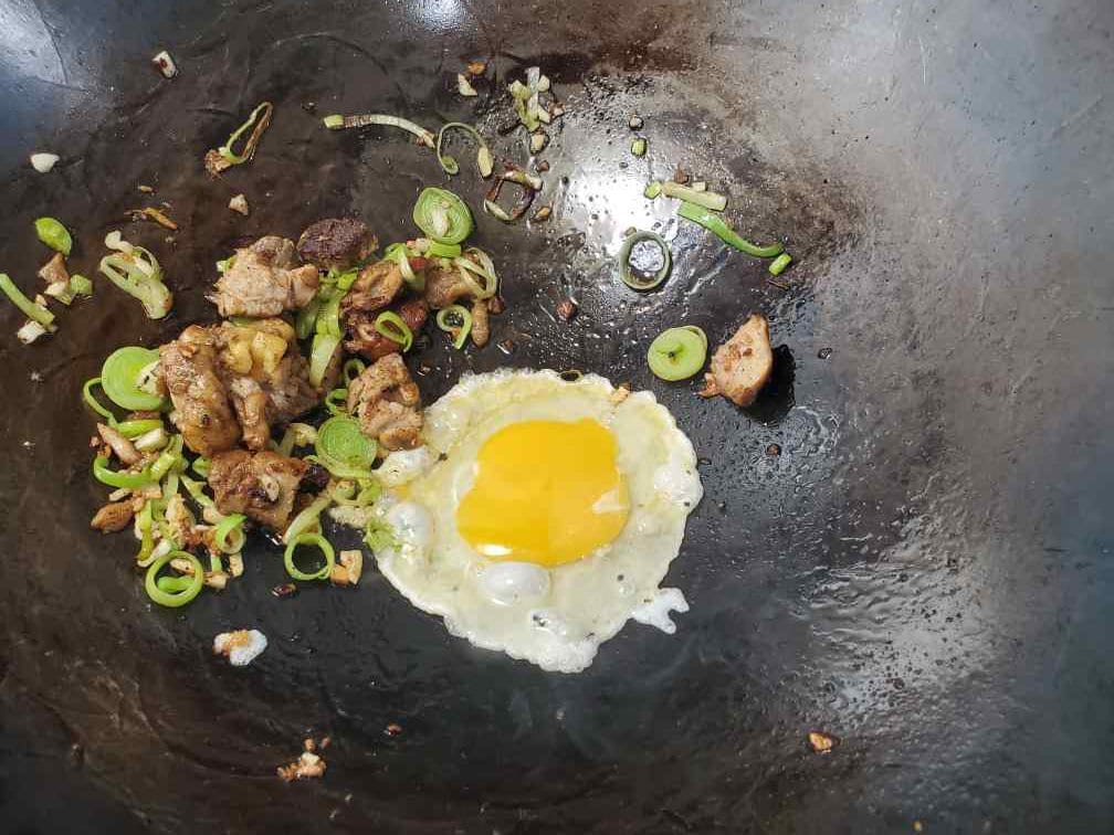 Move everything to a side and crack an egg to the middle of the wok. Let it fry for few seconds and then scramble the egg. When the egg is almost cooked, mix with the rest of the ingredients on the wok.