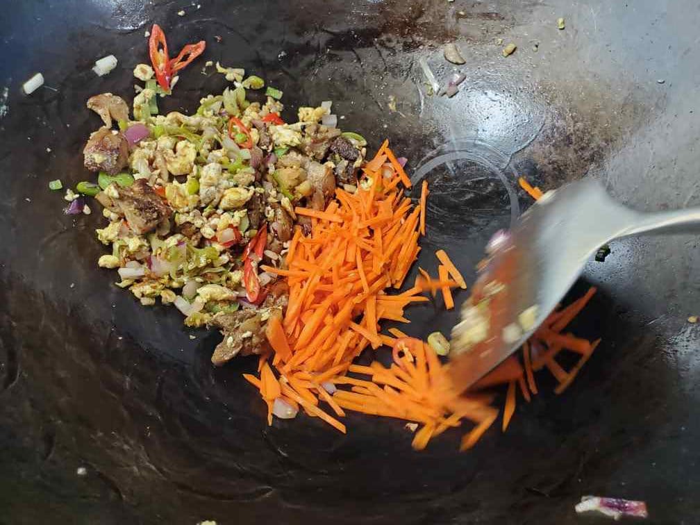 Again, move everything to aside and add the julienned carrots. Mix only the carrots to fry them a little bit.
