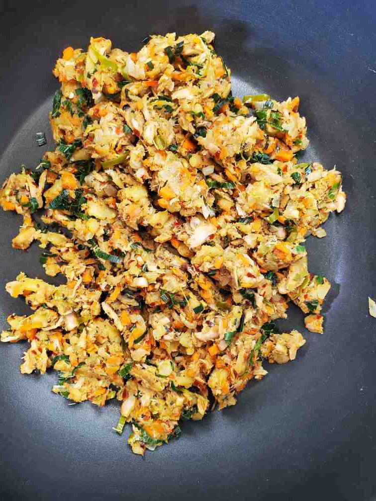 Heat a tbsp of coconut oil. Add chopped garlic, chopped onion, green chilies and fry until onions get sweaty. Then add the diced carrot and some salt. Cook on medium until carrots are cooked all the way through. Then move the veggies to a side of the pan and add the chili flakes. mix and toast a bit and add the onion and carrot mixture. Add your potatoes. stir fry a bit and add the drained tuna. (You can use canned mackerel too but the taste and smell would be different.) Break with the spoon and stirfry for about a minute. Add the chopped leeks. Mix and well. If you feel like the mixture is too dry, add about a tsp of water and stir. Turn off the heat. Let the mixture cool down.
