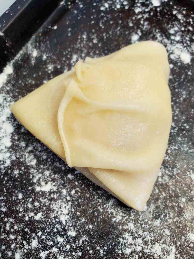 - Then make the pancake one by one, put the filling in, and wrap and arrange them on a tray which is dusted with flour. You can do this like a production like. make one pancake then transfer that to a plate and pour batter to another pancake. While the second pancake is cooking, wrap the first one and put it on the tray.
