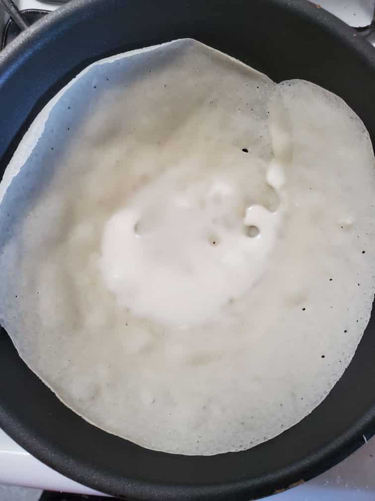 Heat a nonstick skillet or nonstick hopper pan (which is what I use). Brush a thin coating of oil using a paper tissue. Add about 1/3 cup of batter and swirl the pan to spread it evenly. Cook for about 30seconds to a minute or until it's cooked all the way through. (cover the pan if you use a nonstick hopper pan. If you feel like the pancakes are thick and not flexible, add a bit of water, a tbsp at a time, and thin it out. What you need is a very thin and flexible pancake.