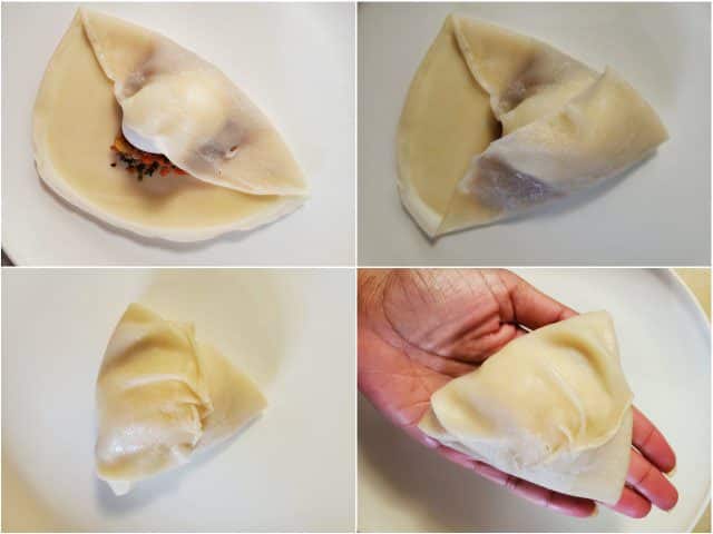 Fold from three corners to the middle to make it into a triangle. Check out the photo. Try not to leave much air inside the roll when you fold it. (why? read the tips on the recipe description)