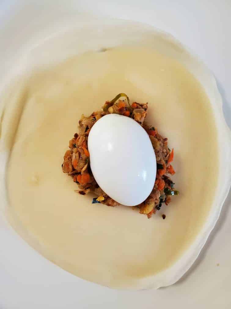 Carefully transfer the pancake into a plate. Do not flip. Add 3 - 4 tbsp of filling in the middle. Also, place half of a boiled egg on the top. If you can roughly arrange the filling as a triangle, it would be easier in the next step. (Meanwhile, you can make another pancake too. Then you can do this whole process like a production line)