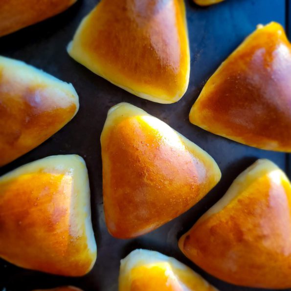 Arrange on a large baking sheet and cover with plastic wrap so it wouldn't dry out. Always keep all the dough pieces covered so they don't dry out and harden the surface. Repeat the process to all the dough balls and arrange the triangles on the baking sheet. Make sure to leave plenty of space between each triangle so they have enough space to rise up and wouldn't stick together in the oven as they puff up in the oven. Let them rise again until they become double in size. This time it would take relatively less time to rise up. (around 30 - 45mins) Do not overproof/wait too long, they'd collapse in the oven.