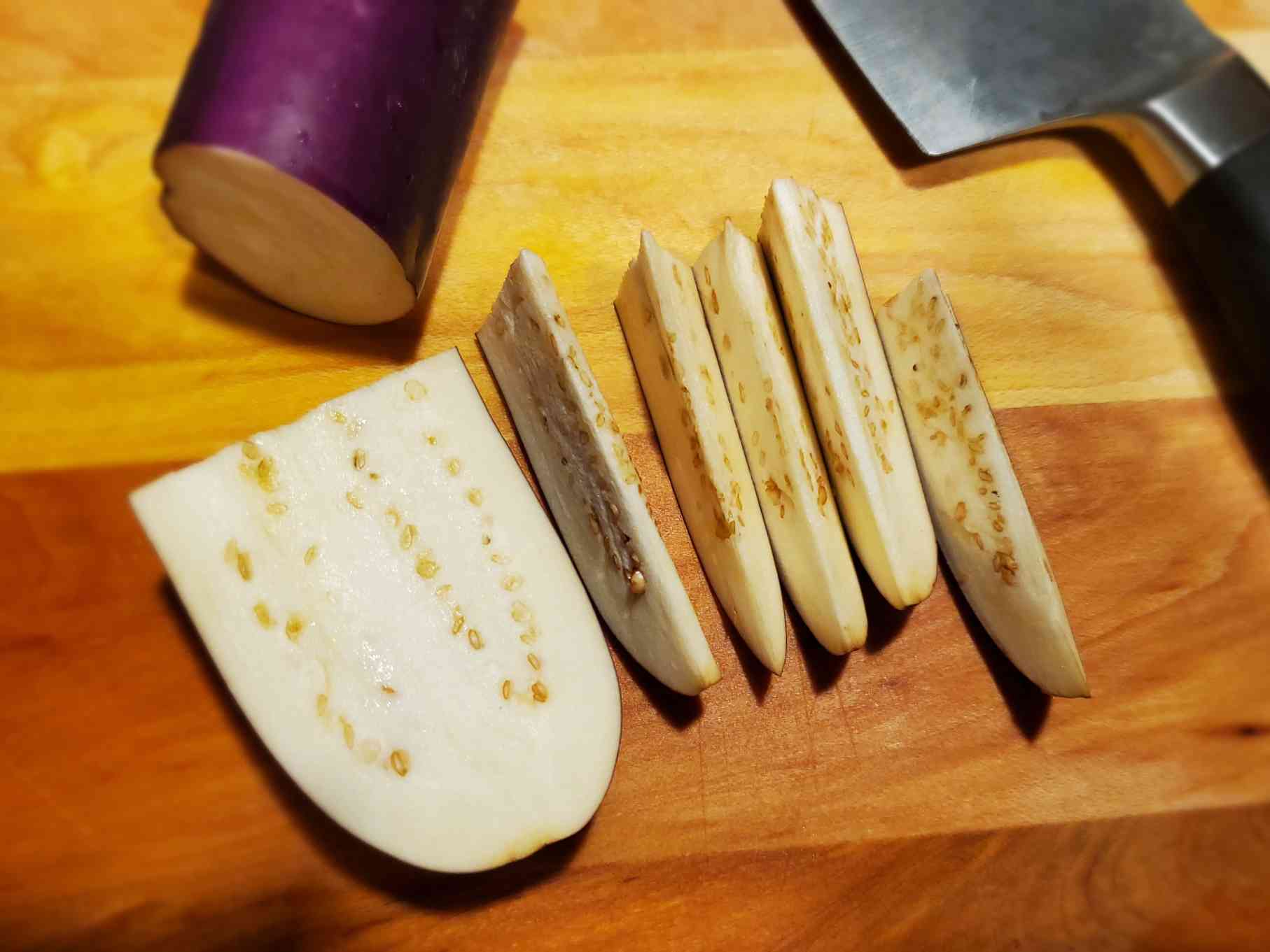 I’m using Chinese eggplants here. Try if you can find any kind of Asian eggplant rather than using large Mediterranean eggplants. They can become mushy as they’re meatier and absorb more oil if you’re deep frying. But if you can’t find Asian eggplants these large eggplants work just fine.
