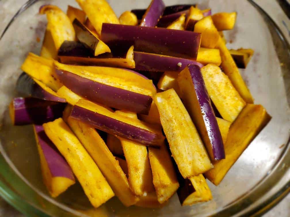 Mix in your turmeric powder and oil with eggplant pieces. Each and every piece has to be coated with oil. If you’re deep-frying, no need to mix oil, just mix your turmeric. (more info about deep frying in the recipe description above)