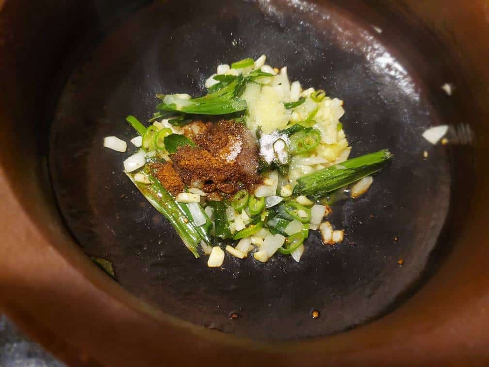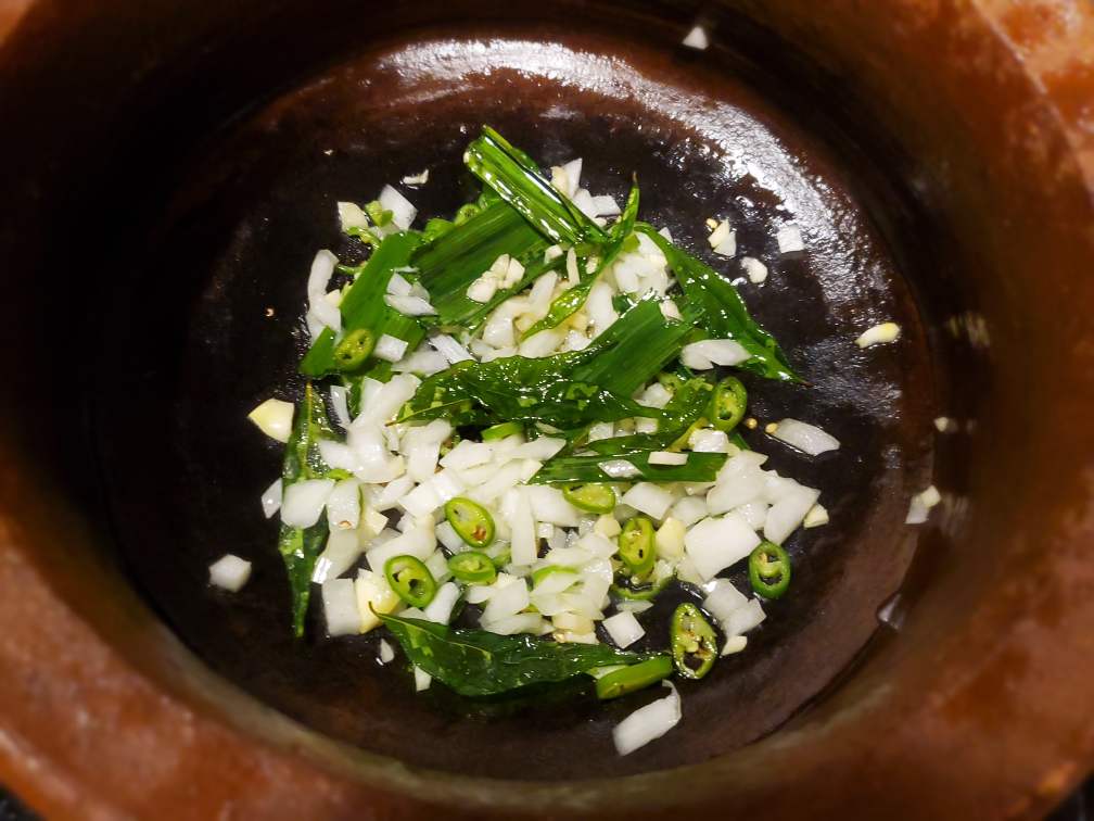 When you’re done frying your eggplants, Heat a pan (a claypot is ideal but any other thick bottom pan/pot would work too), add coconut oil (or cooking oil of your choice) and let the oil heat up. Then add curry leaves and pandan leaves. Let them splatter. Add chopped garlic, chopped onion, sliced green chilies and let them fry a little bit.