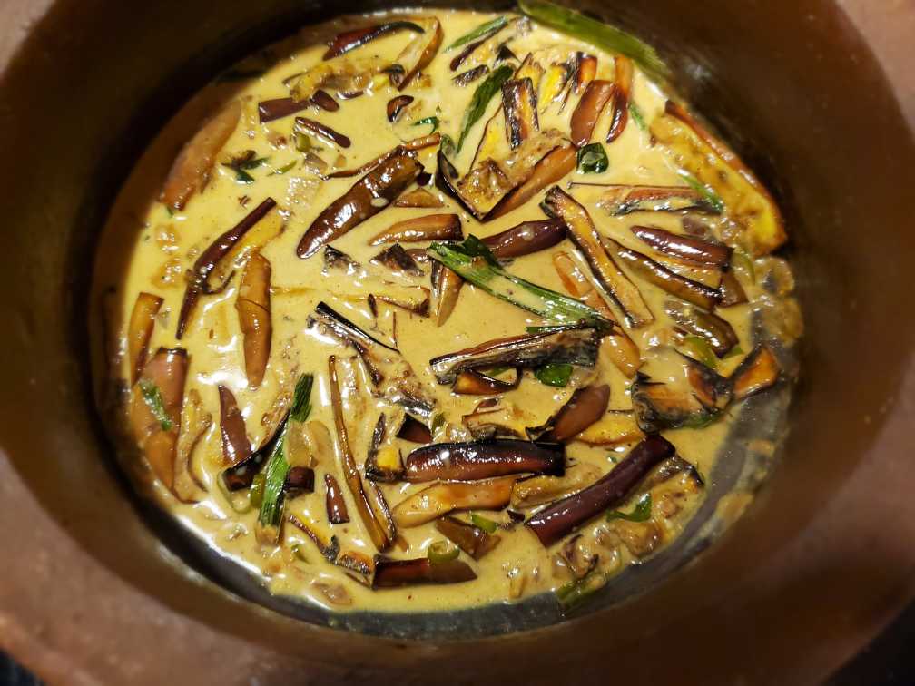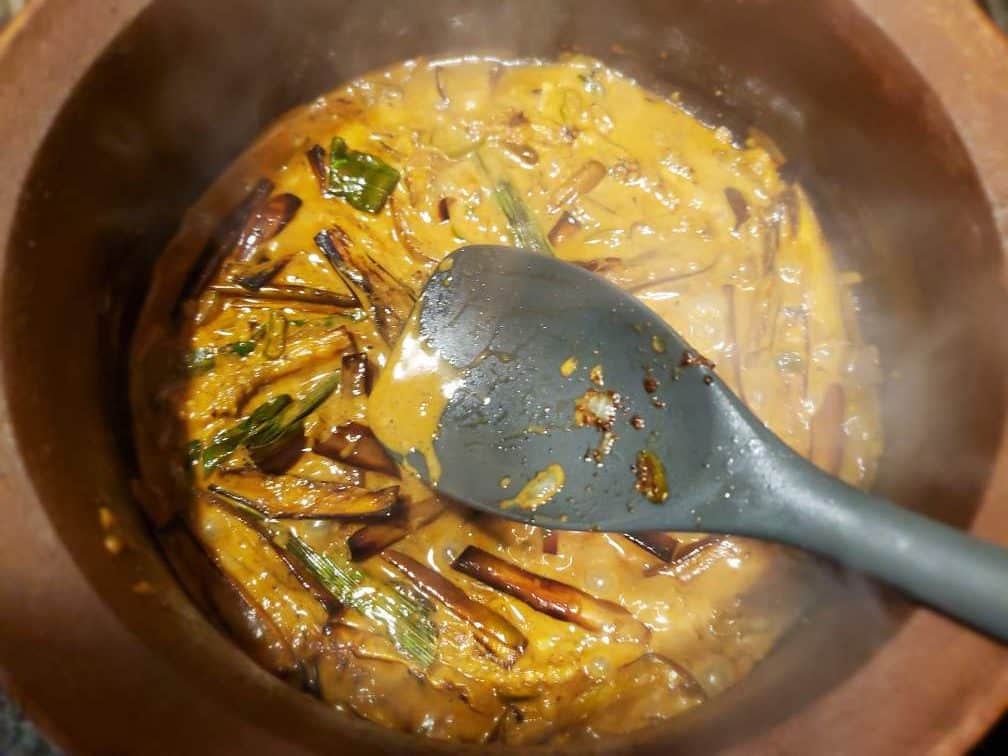 - The deep-fried eggplants get mushy very quickly unlike air-fried eggplants. To avoid this, use less coconut milk than I mentioned and cook it in low heat without stirring it too much.