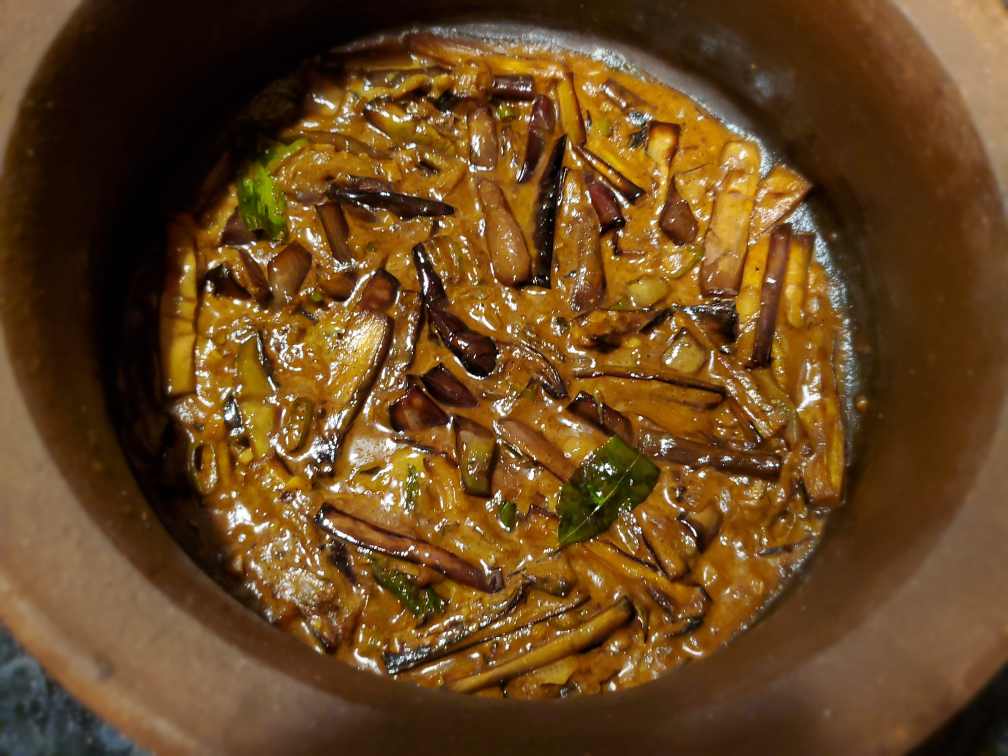 Cook uncovered on low heat until the eggplants rehydrates, the curry thickens up and you get the desired amount of gravy. This curry is better as a dry curry so I usually dry up the curry until there is only a little bit of gravy left. And when the pot cools down it thickens up even more.