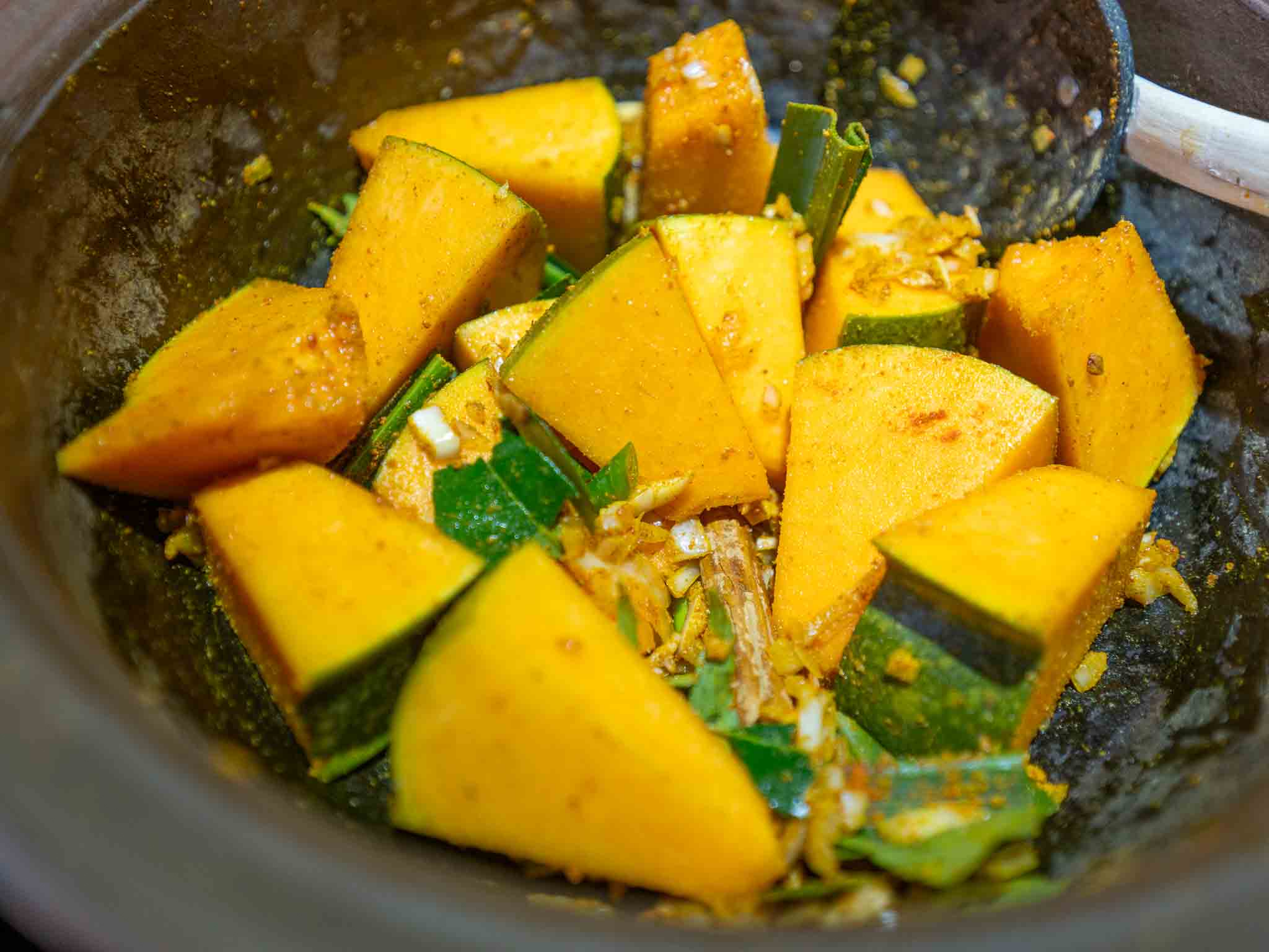 1. Add pumpkin pieces, onion, garlic, green chili, curry leaves, pandan leaves, turmeric, cayenne pepper powder, curry powder, fenugreek seeds, cinnamon sticks, and salt into a pot or a large saucepan. Mix everything well so all the pumpkin pieces coat in spices.