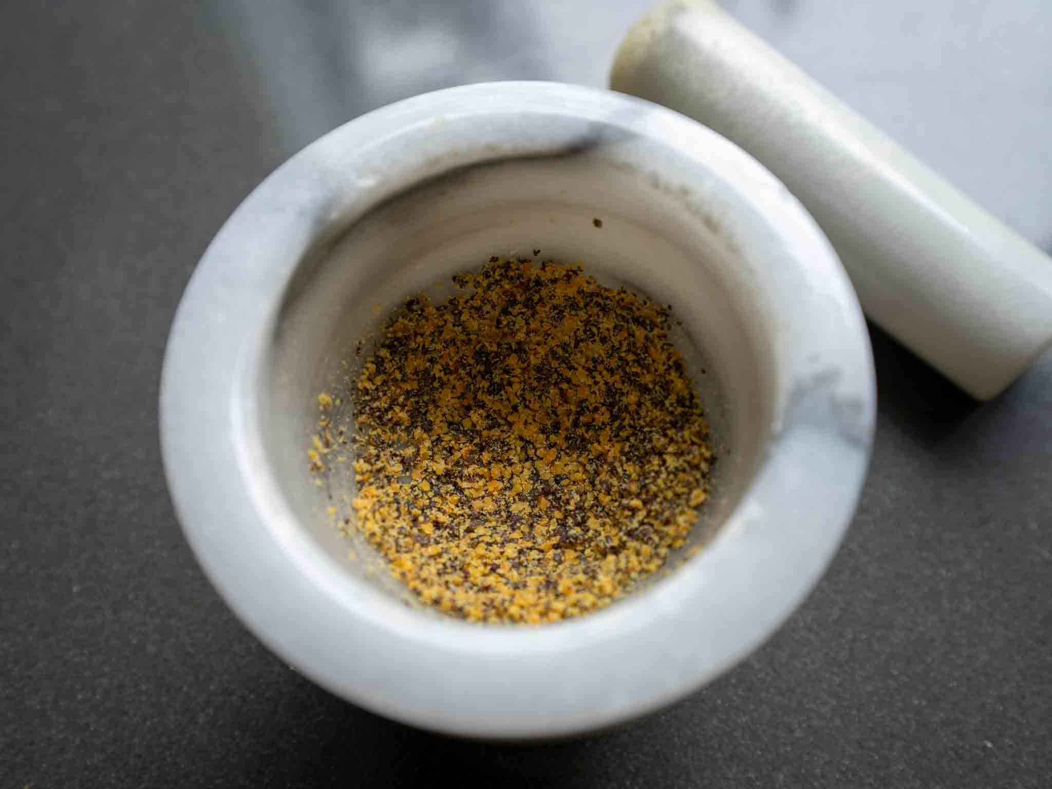3. Meanwhile, add the mustard seeds to a small mortar and pestle and grind them until they turn into a rough powder.