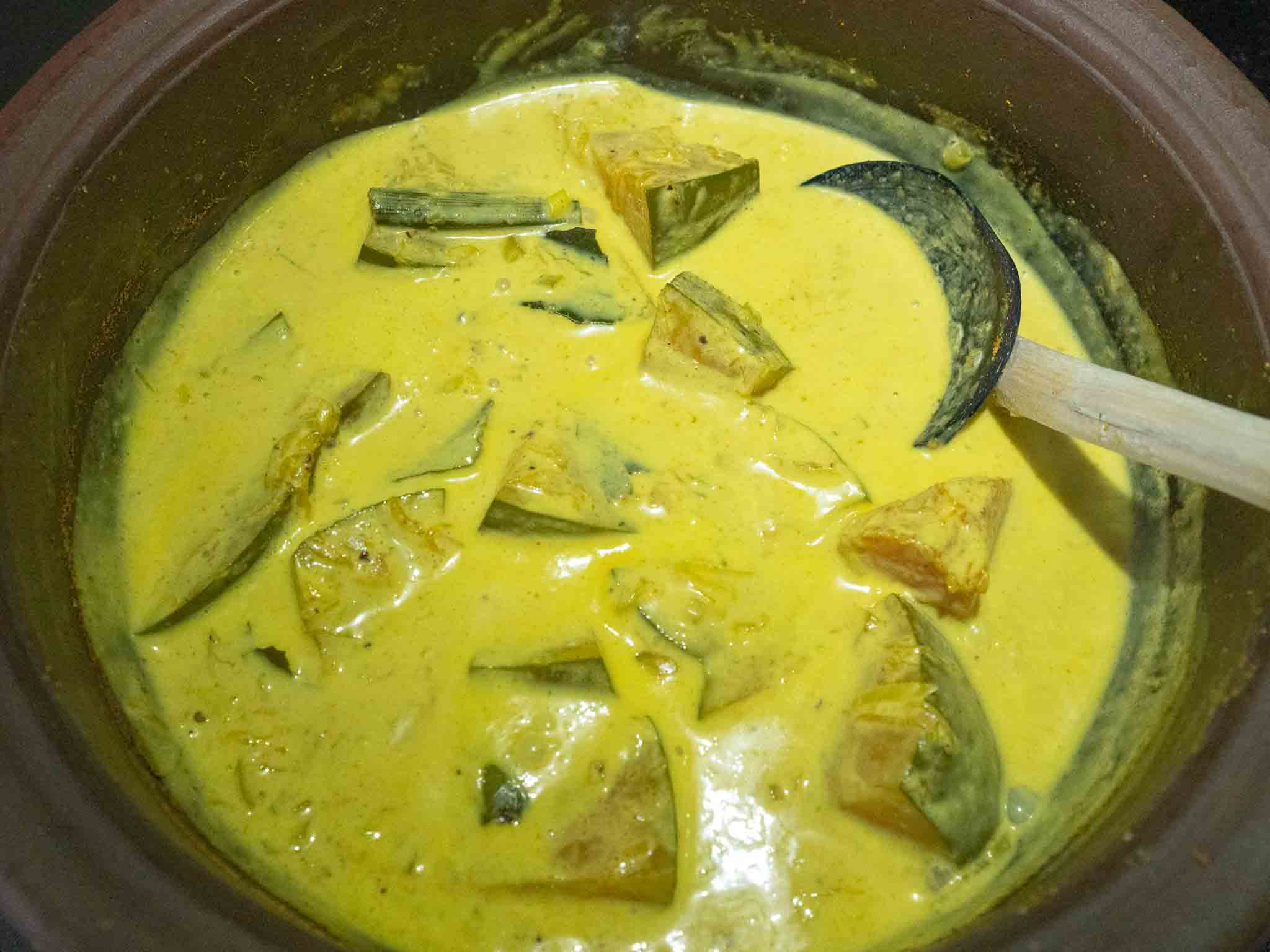 6. Let the curry slowly come to a simmer and let it cook on very low heat for about 3 minutes. Taste and adjust the salt. (If your pumpkins are not sweet enough, you can add a little bit of sugar as well)