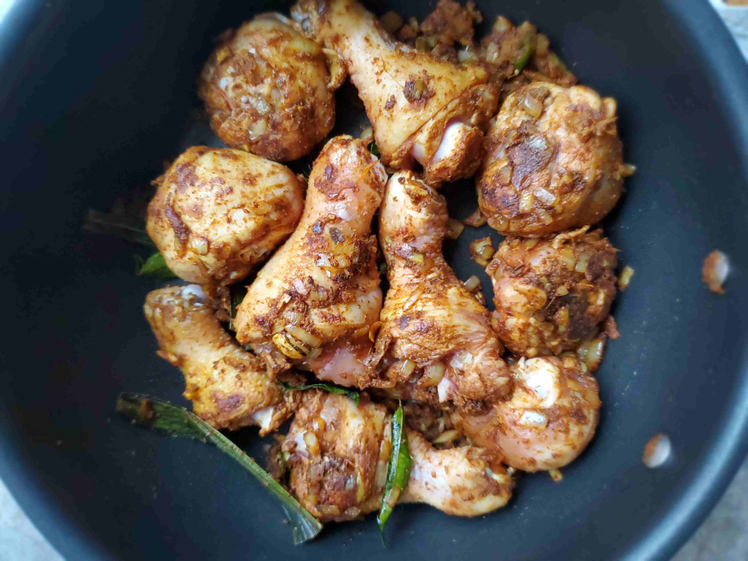 • If you’re not in a hurry, you can marinate the chicken overnight in the fridge with some Sri Lankan roasted curry powder, roasted chili powder, pepper, salt, and a bit of vinegar. This is the quick version so I’m not going to marinate the chicken.