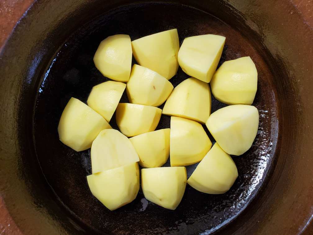 Wash and peel the medium size potatoes (a waxy type like Yukon gold potatoes is preferred). Cut them into quarters or to 6 pieces of your potatoes are on the bigger side. Make sure all the potatoes are roughly equal in size.