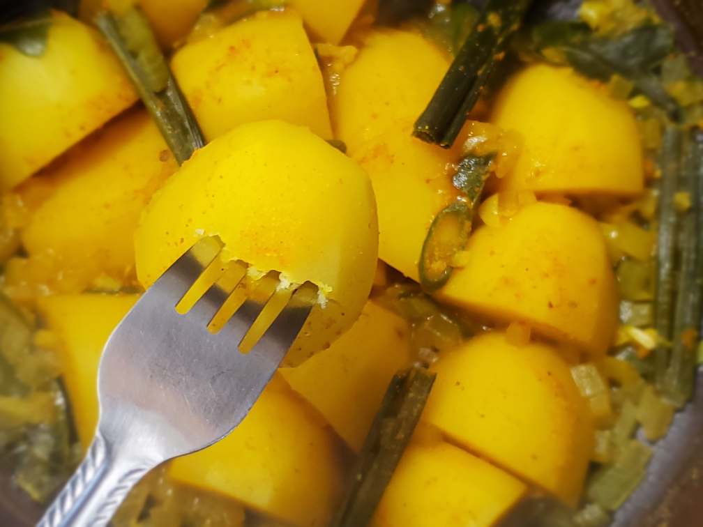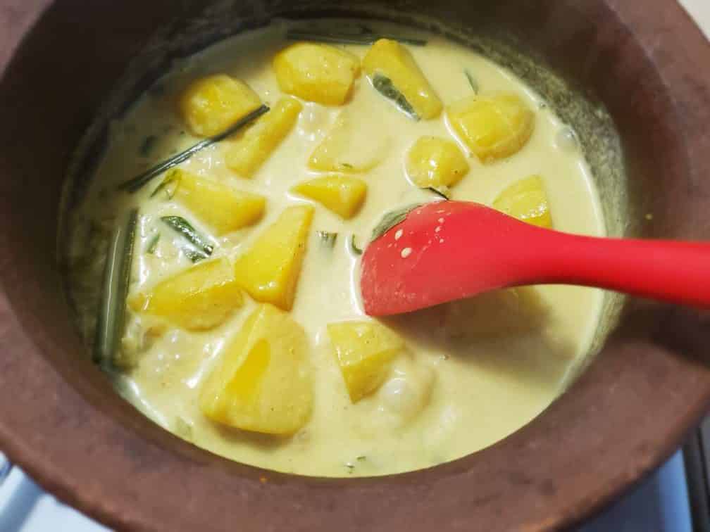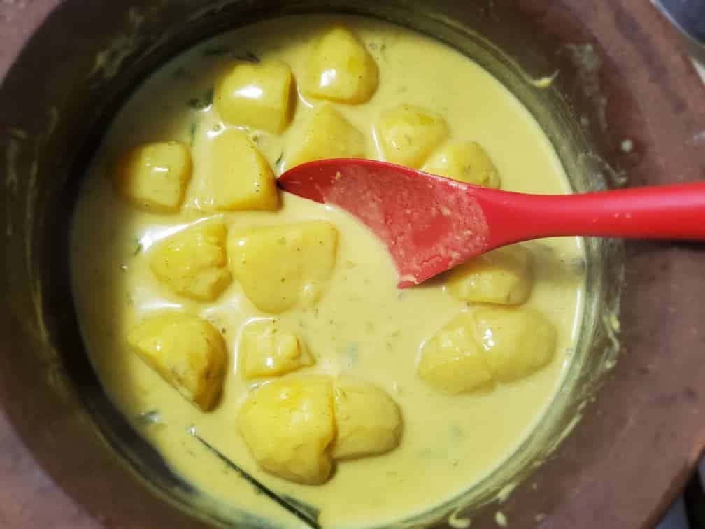 - Do not over boil your potatoes as they become mushy when they’re overcooked. Boil until they are just fork-tender and then add your coconut milk.