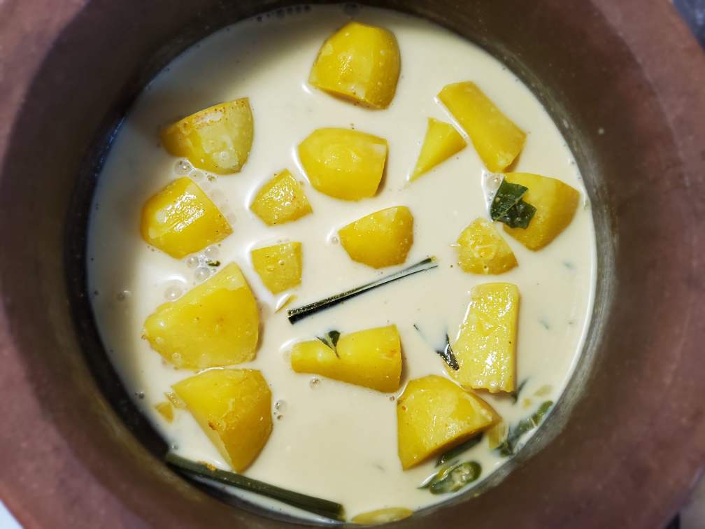 Mix gently without breaking your potatoes. Bring the coconut milk to simmer. And then keep gently mixing the curry continuously for about 5 mins without breaking potatoes so your coconut milk wouldn't curdle. Make sure you taste the curry and adjust the salt too.